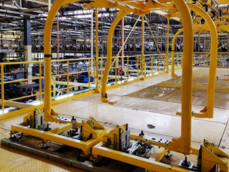 ? FDS底盤輸送線,包括升降機(jī)、空中摩擦輸送機(jī)、車身吊具、吊具維修區(qū)等設(shè)備;