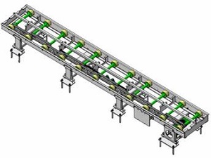 該系統(tǒng)包含的主要輸送機形式有:滾床、轉(zhuǎn)臺、橫移機、橫移鏈、升降機、鏈床、板鏈等等,由于托盤載荷較大,對設(shè)備的承載能力有較高的要求。鏈床主要應(yīng)用于合裝線及相關(guān)托盤儲存線,它運行平穩(wěn)、噪音低、可實現(xiàn)高速運行,尤其適用于自動化程度和精度要求高的合裝線。